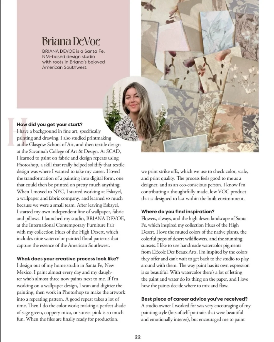 Offered on wallpaper, fabric & pillows, Hues of the High Desert, pays homage to the enchanting beauty of the high desert landscape of Santa Fe, New Mexico, a landscape of sagebrush, tumbleweed, & Apache plume, of dust, flowering cactus, & vast blue skies.